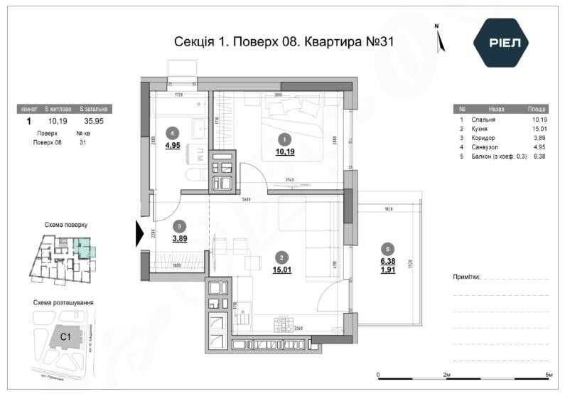 У цій квартирі добре продуманий розподіл простору: окрема спальня площею 10,19 м² створює повноцінну приватну зону для відпочинку, кухня 15,01 м² дає достатньо місця не лише для приготування їжі, а й для щоденного життя, обідньої частини або невеликої зони відпочинку. Коридор 3,89 м² не перевантажує загальний простір, але дозволяє передбачити місце для зберігання, санвузол 4,95 м² залишається повноцінним і зручним у користуванні, а балкон 6,38 м² додає квартирі ще більше функціональності.