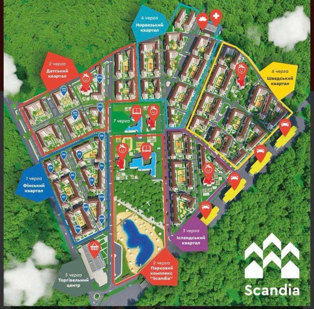 ЖК Scandsa- скандінавське містечко на кордоні міста та лісу. Тут серед природи, в стороні від міста та шуму, зростає реальне європейське містечко, якість простота та естетика, довговічність та функціональність, комфорт, екологічність, безпека для сімї.