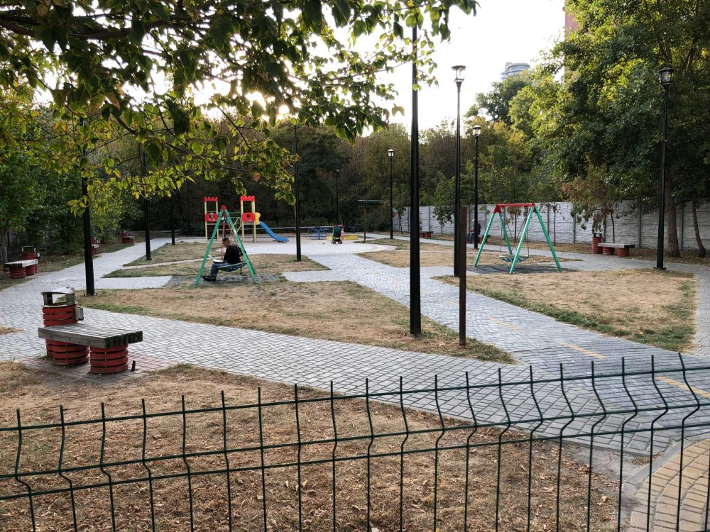 Зелёный двор, спортивные площадки, детские площадки, детский сад и школа.