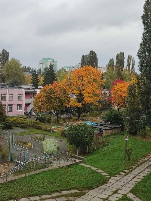 Вікна дивляться у зелений двір.