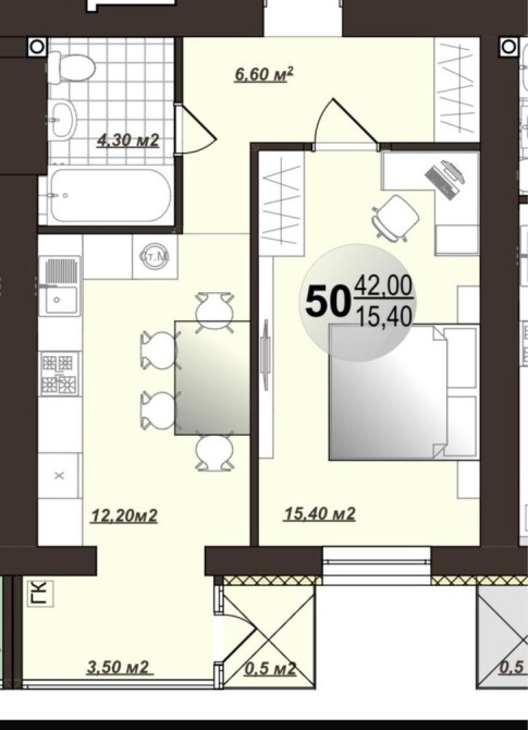 • Общая площадь 42 м2