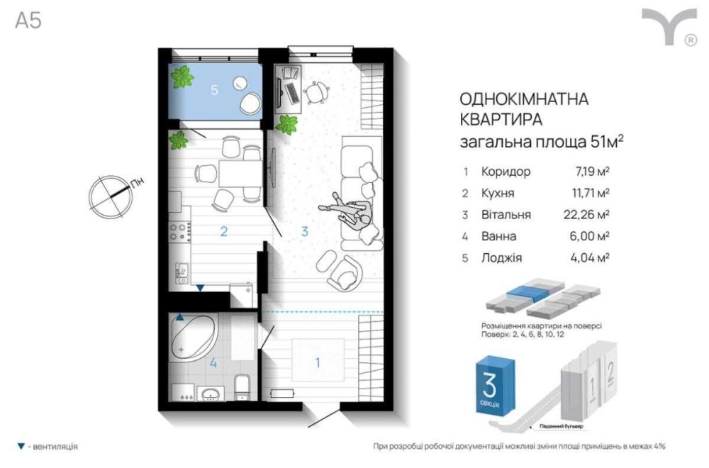 1-кімнатна квартира в ЖК А5 — 51 м² на 12 поверсі з 13 за найкращою ціною!