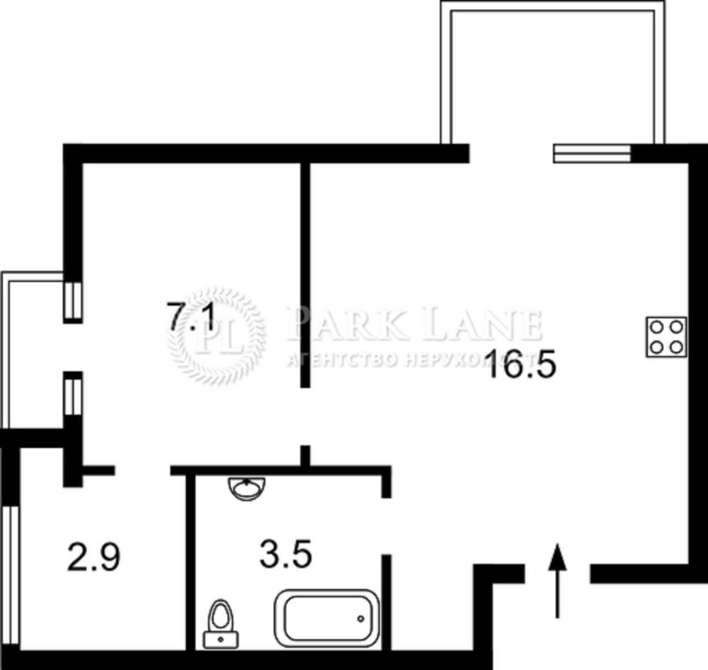 1-кімнатна квартира на 7 поверсі, площа 37,7 м² (кухня 7,1 м², кімната 16,5 м²).