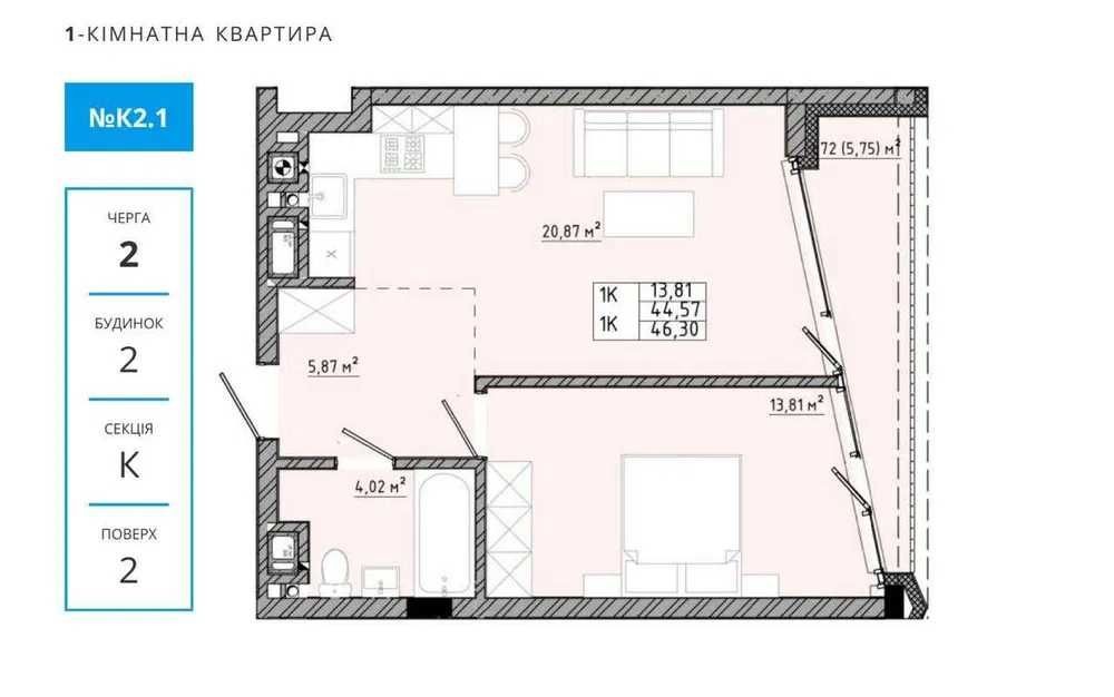 Площа — 46.3 м²
