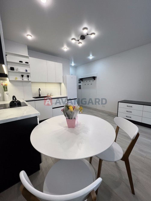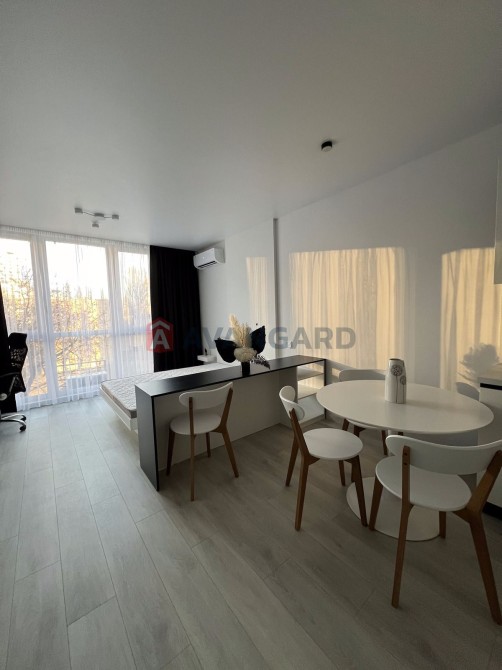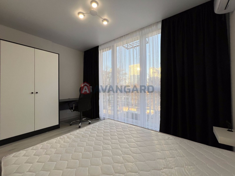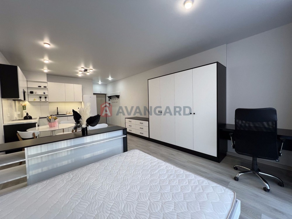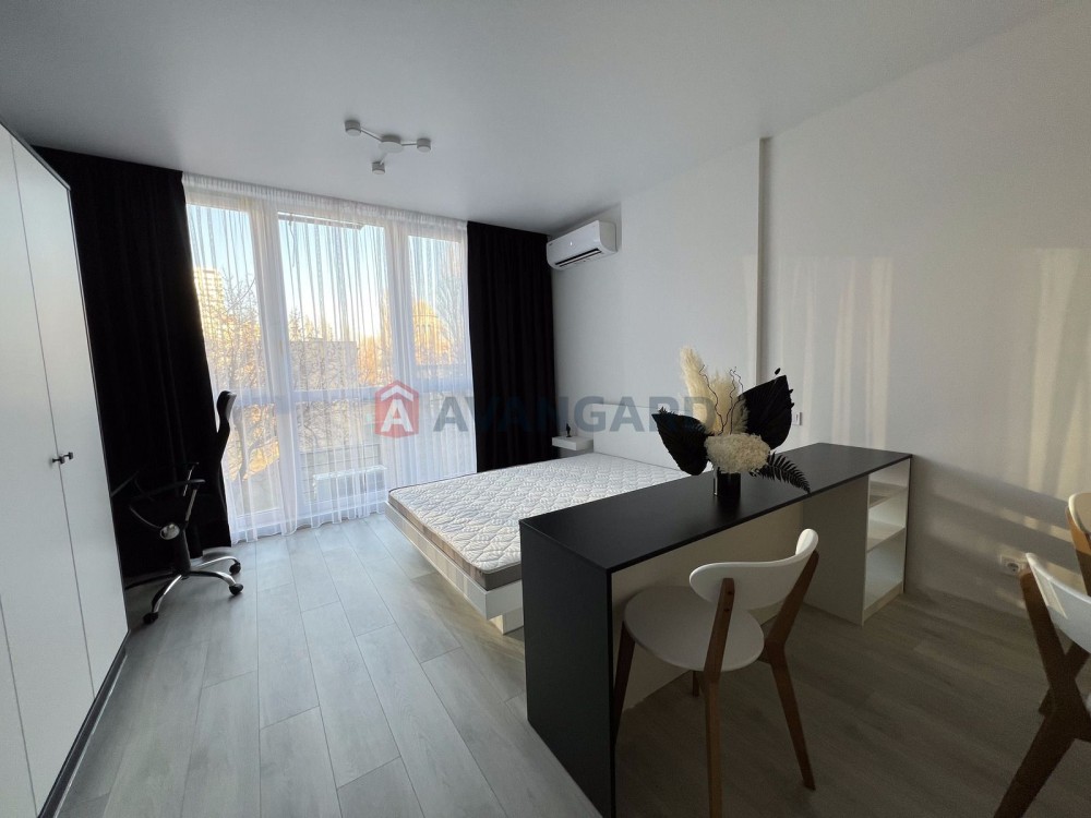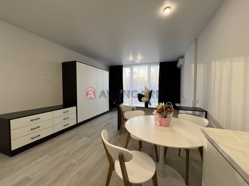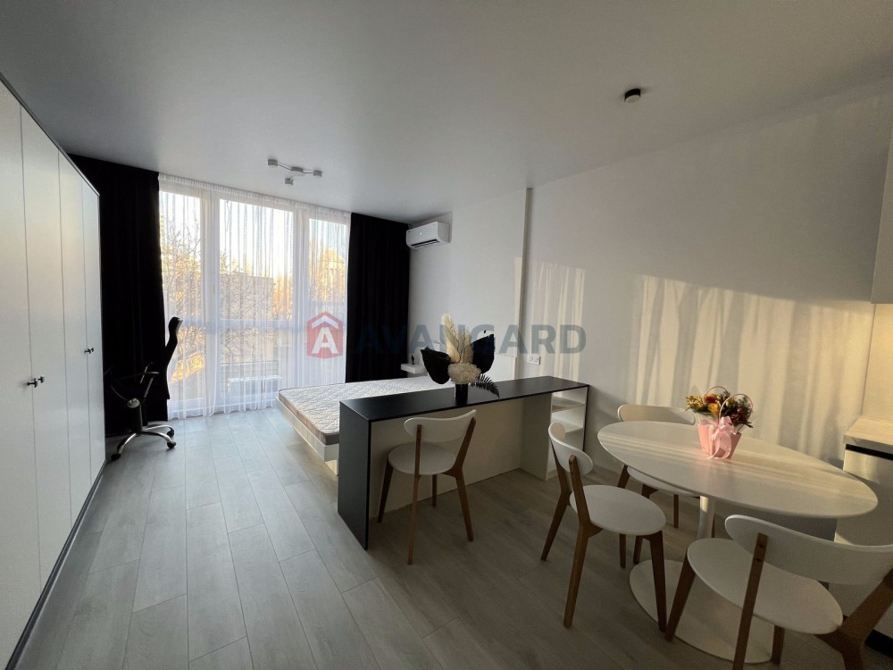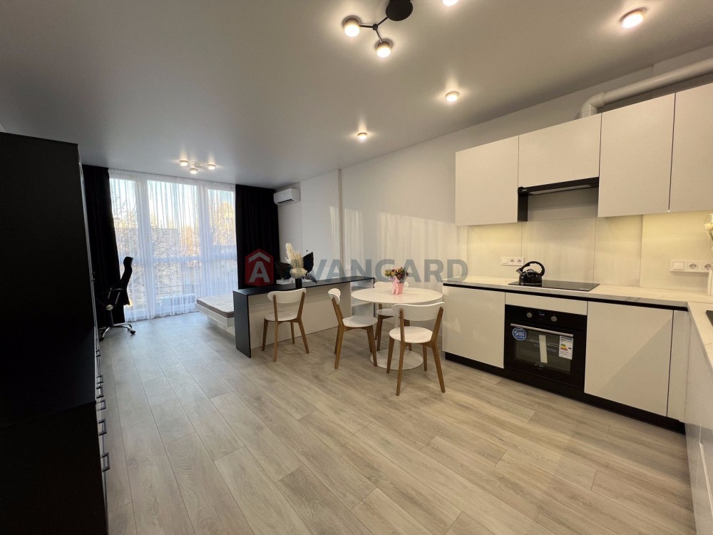 Простора студія з дизайнерським ремонтом, площа 36,5 м.кв., знаходиться на 4 поверсі з 12. Вікна виходять на затишний задній двір.