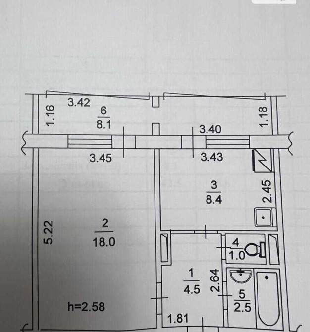 Загальна площа 42.5 м² · житлова 18 м² · кухня 8.4 м²