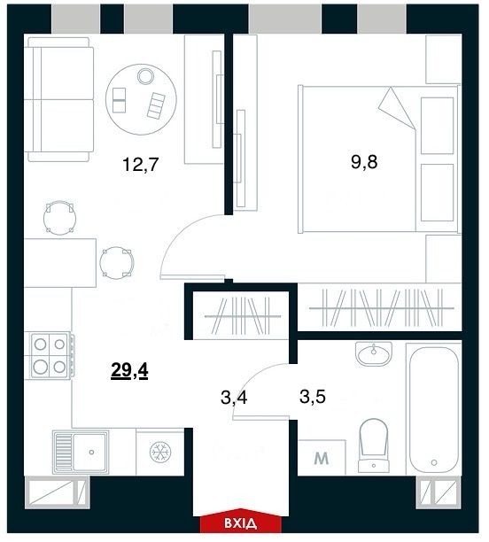 1-кімнатна квартира загальною площею 29,4 кв.м, має комфортне планування з окремими кімнатами: передпокій - 3,4 кв.м, санвузол - 3,5 кв.м, кухня-вітальня - 12,7 кв.м, спальня - 9,8 кв.м. Дуже затишна та світла, панорамні вікна виходять на сонячну сторону.