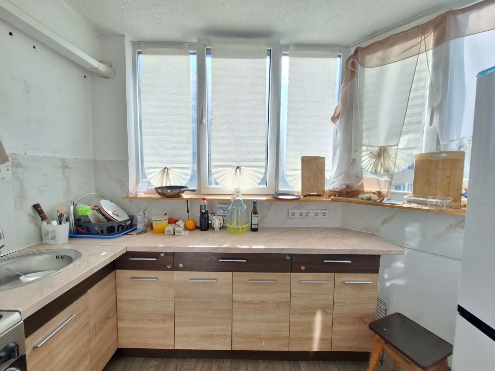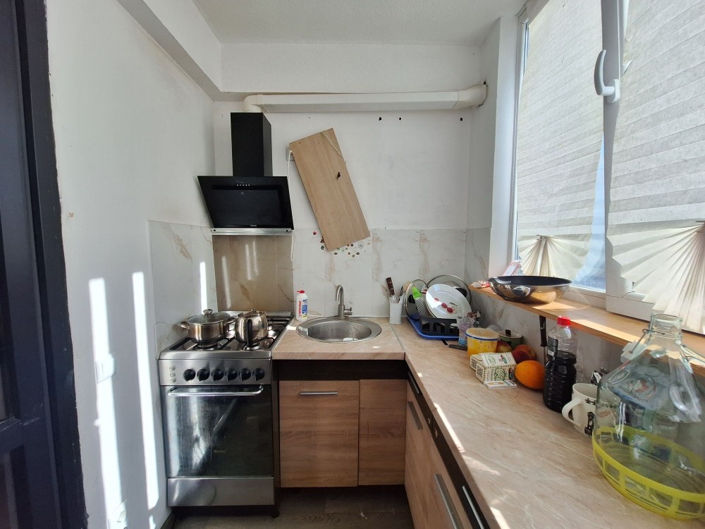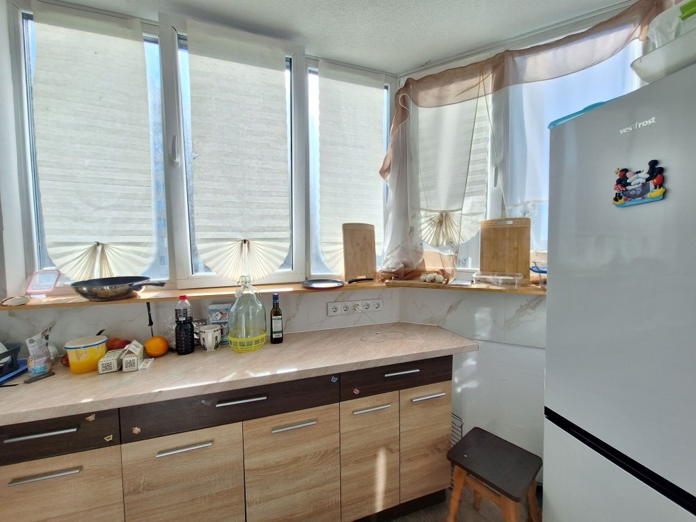 Квартира загальною площею 38.3 кв. м , кімната 16.1 кв. м , кухня 9.1 + збільшена на 2.5 кв.м за рахунок балкону ( утворилась кухня- вітальня) коридор 7.4 кв.м, санвузол суміщений 4.4 кв. м