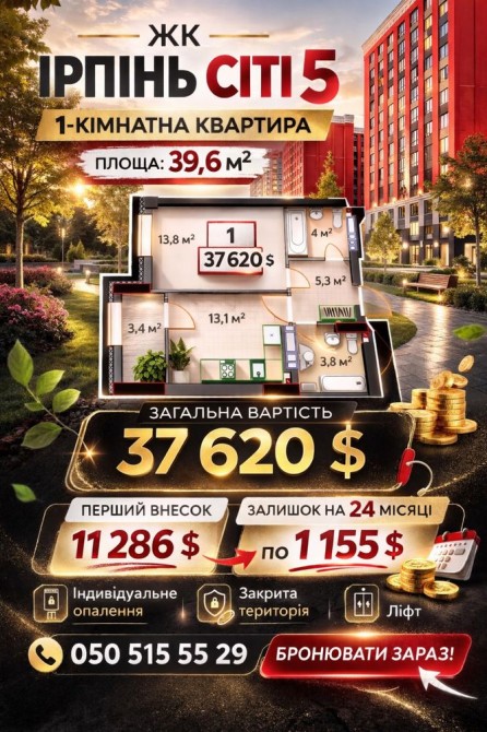 1-кімнатна квартира 39,6 м² в ЖК Ірпінь Сіті 5 — вигідна ціна та розтермінування