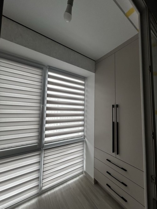 Панорамна лоджія з компʼютерним столиком та шафою.