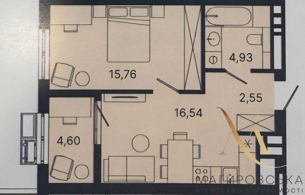 Загальна площа 44,28 м2. Простора кухня-студія площею 16,5 м2 із заскленою лоджією, окрема спальня 15,76 м2 та суміжний санвузол. Квартира не кутова, дуже світла, з гарним відкритим видом на місто, який не буде забудований.