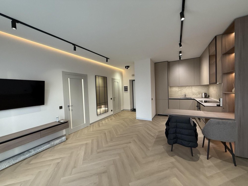 Продається сучасна квартира площею 45 м², розташована на 3 поверсі з 5 у новому житловому комплексі. Житло має зручне планування: простора кухня-вітальня, окрема спальня, гардеробна та санвузол. Інтер’єр оформлений у сучасному стилі з використанням якісних матеріалів, що створює світлий та комфортний простір для проживання.