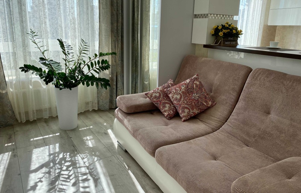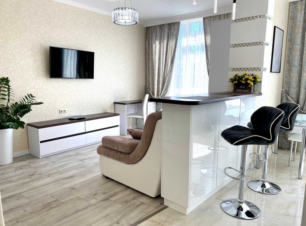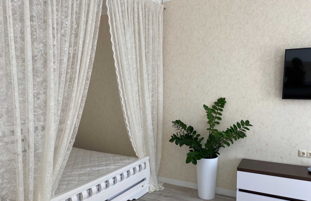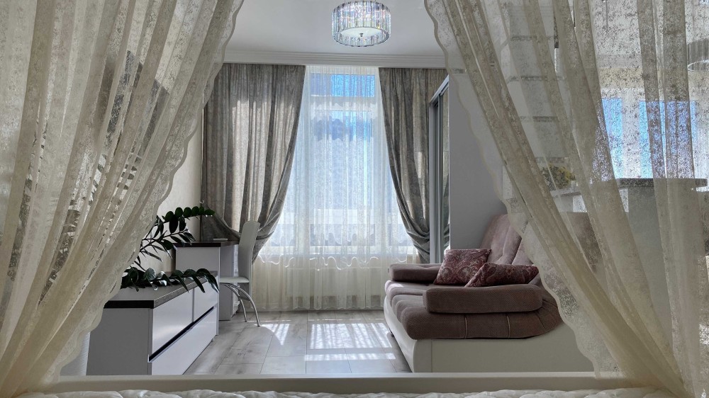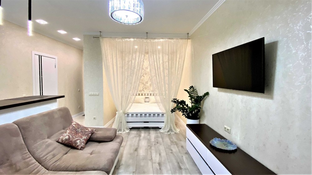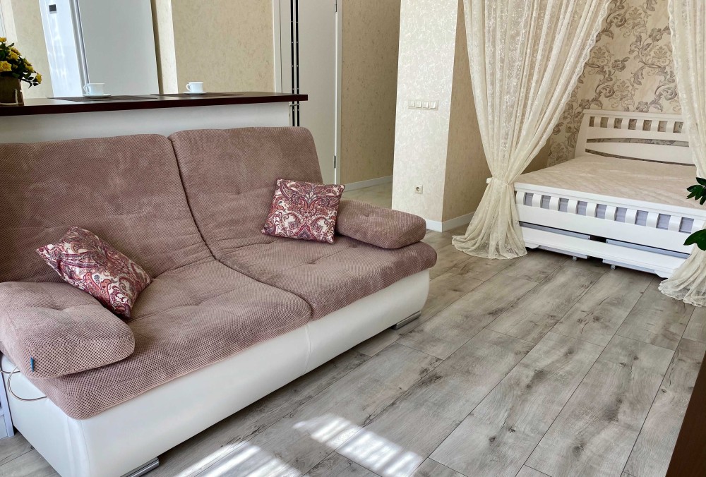 -Белоснежная 1-ком. квартира, словно зефирка ,с мягким диваном и роскошной двухспальной кроватью.