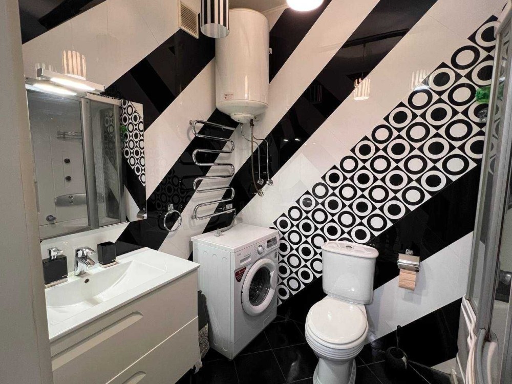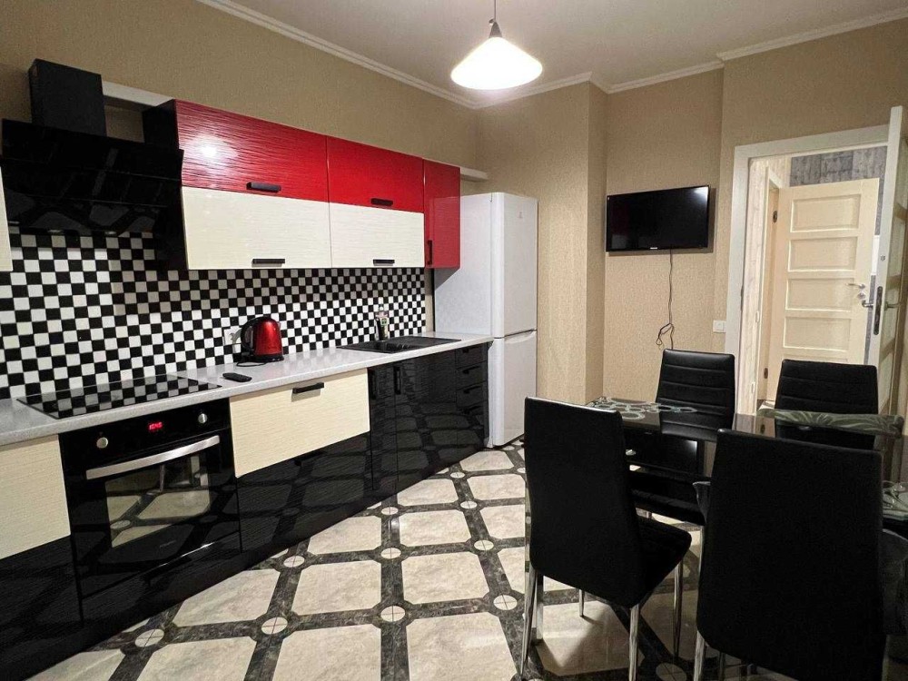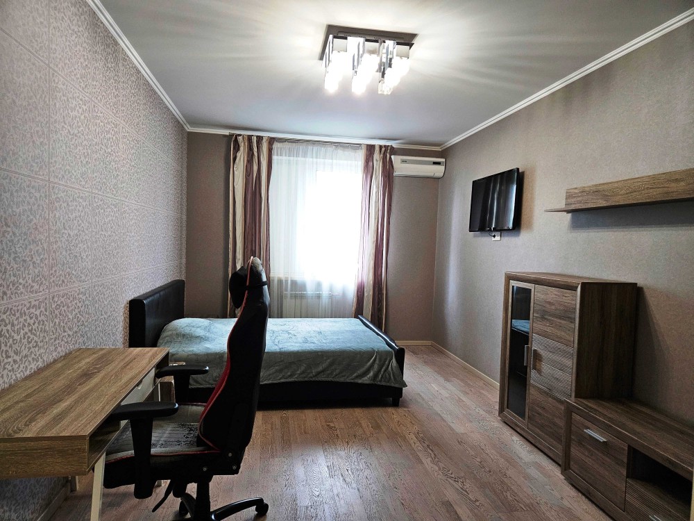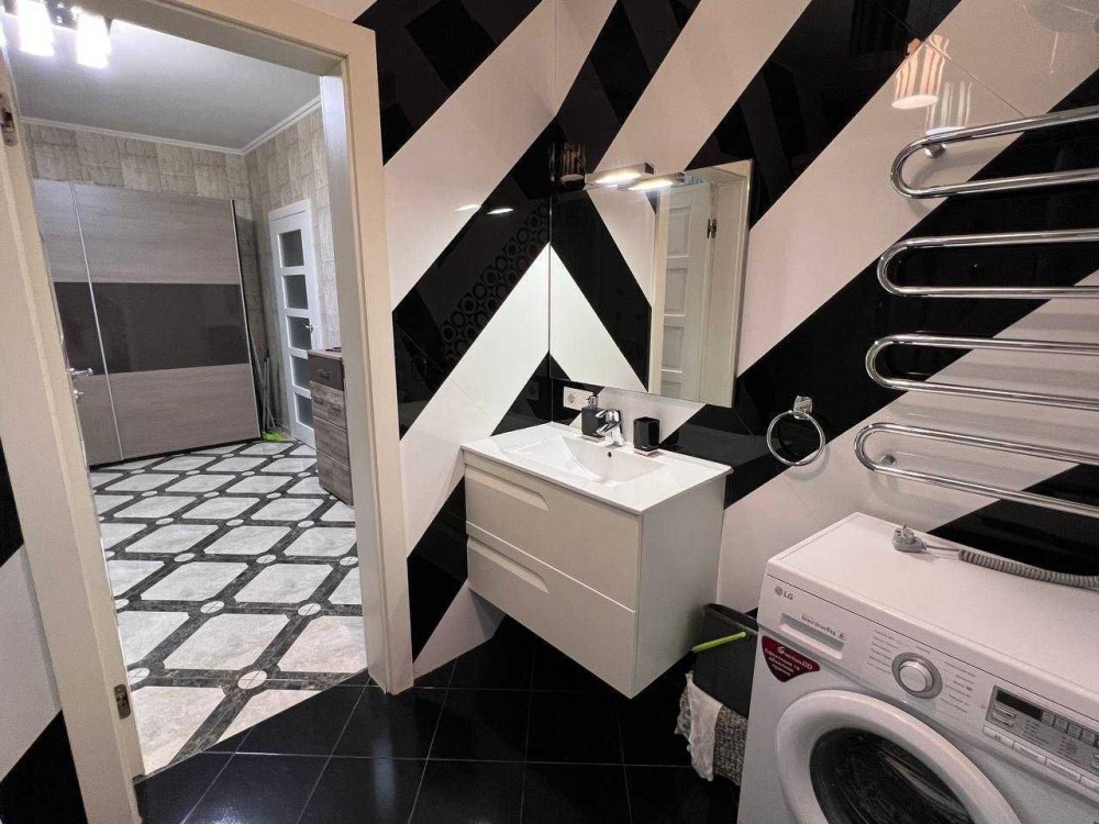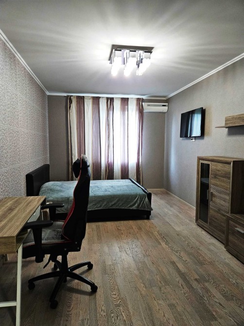 7/18 пов., 51 м². Сучасний будинок, тихий район. Квартира з дизайнерським ремонтом, повністю укомплектована меблями та технікою: кондиціонер, бойлер, 2 LCD-телевізори, швидкісний інтернет, паровий гідробокс та гідромасажна ванна. Квартира теплая и уютная. Під будинком — дворівневий паркінг, працюють ліфти, вода та опалення від генератора.
