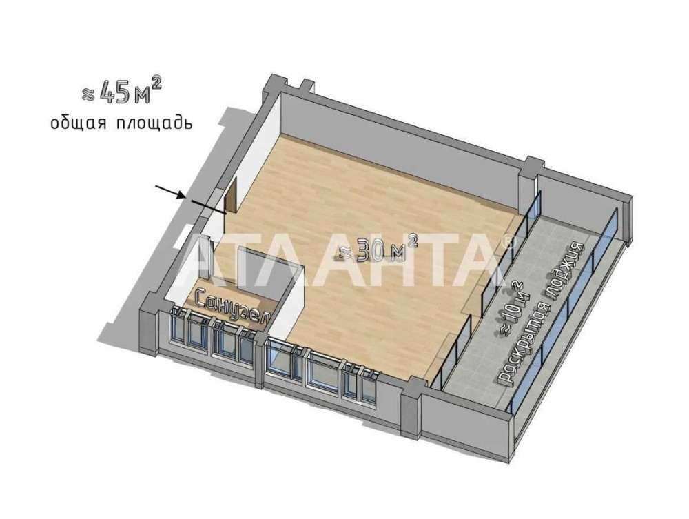 Общая площадь ≈ 45 м², единое пространство ≈ 30 м² + раскрыта лоджия ≈ 10 м², санузел.