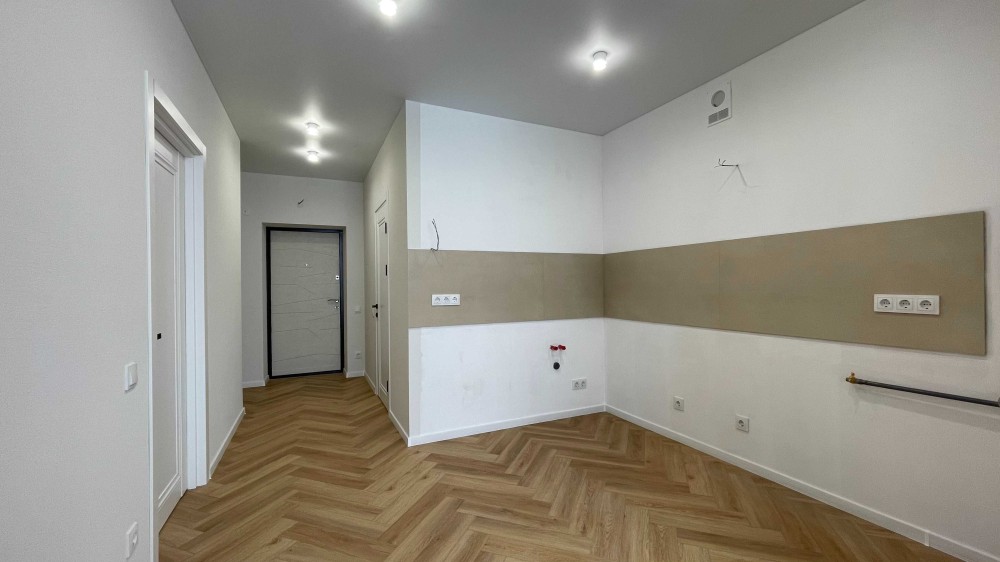 На підлозі постелений якісний кварц-вініл у коридорі, кухні, кімнаті та на лоджії, що забезпечує довговічність і комфорт.