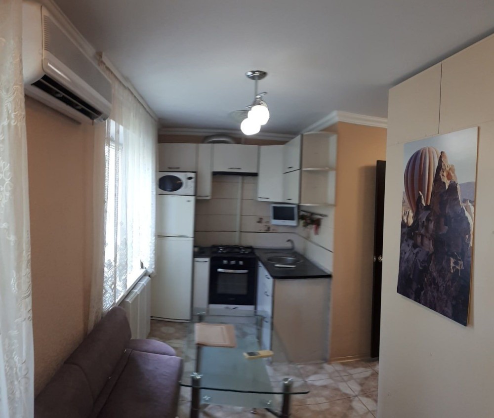 Квартира небольшая студия с балконом застекленным, укомплектована всей необходимой мебелью и техникой.
