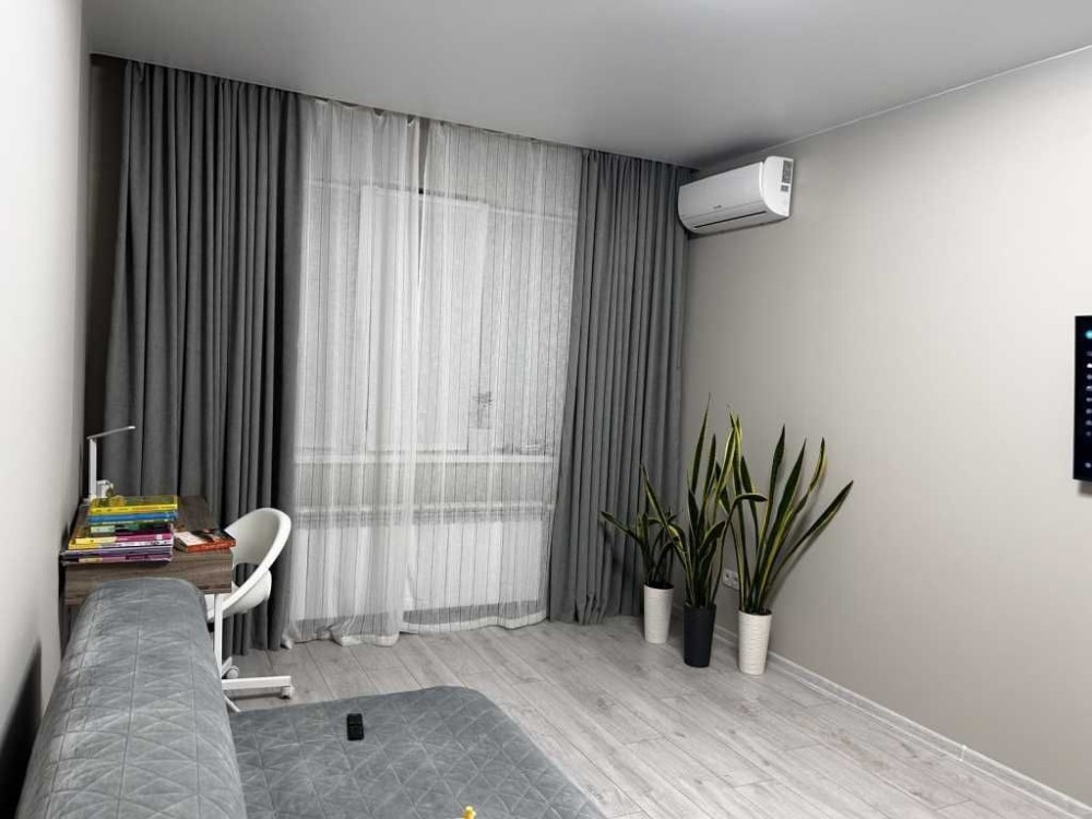 Натяжні стелі, кондиціонер, повністю укомплектована меблями та технікою — все залишається новим власникам.