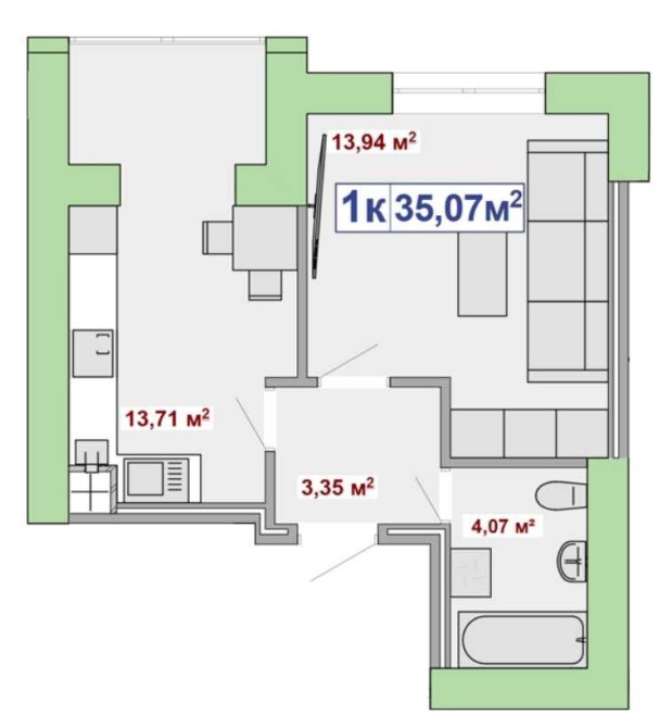 • Общая площадь 35.07 м2