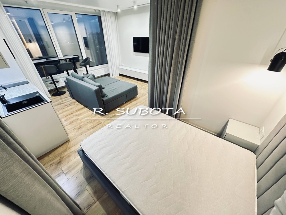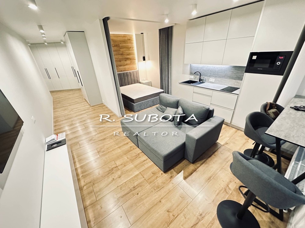 Квартира общей площадью 40м2 спланирована в кухню-студию, кровать в нише, с/у.