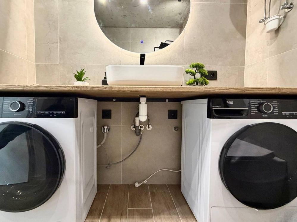 Суміжний санвузол оснащений ванною, інсталяцією, пральною та сушильною машинами.