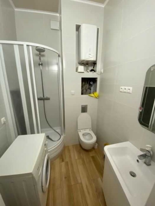 Підлога та стіни обезшумлені, з вулиці виконана теплоізоляція. Всюди екологічна штукатурка і блискуча біла фарба. Витяжний вентилятор з датчиком вологості, бойлер, пральна машина, кондиціонер, посудомийна машинка.
