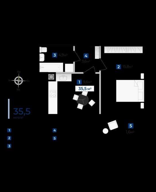 Квартира має оптимальну площу — 35.5 м² з функціональним та продуманим плануванням: окрема кімната, що забезпечує комфорт і приватність.