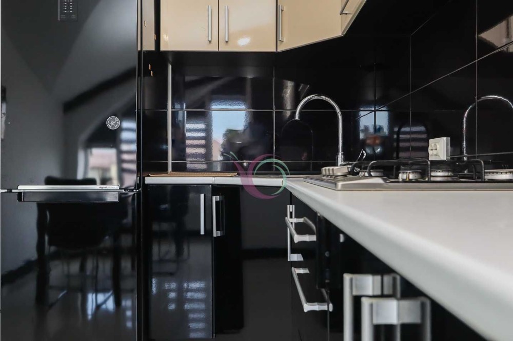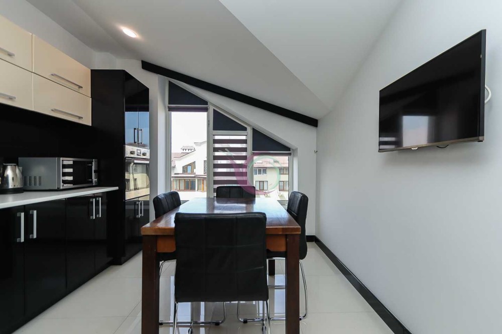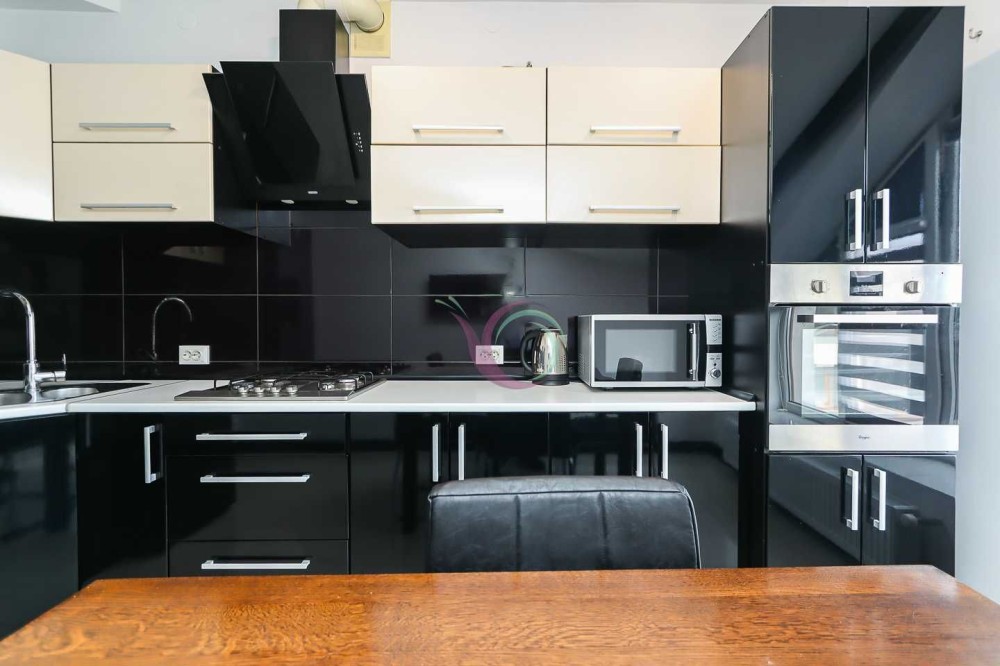 Кухня обладнана шафами для посуду, холодильником, плитою, духовою шафою, мікрохвильовою піччю, витяжною вентиляцією тощо. А також має зручну обідню зону.