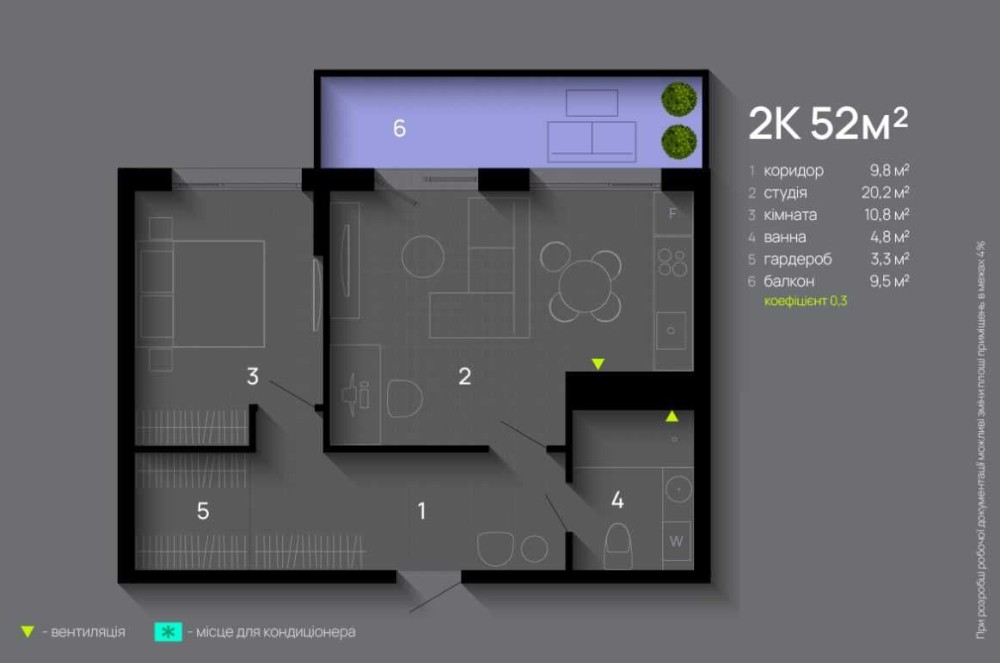 Балкон - 9,5 м2 (по коефіцієнту)