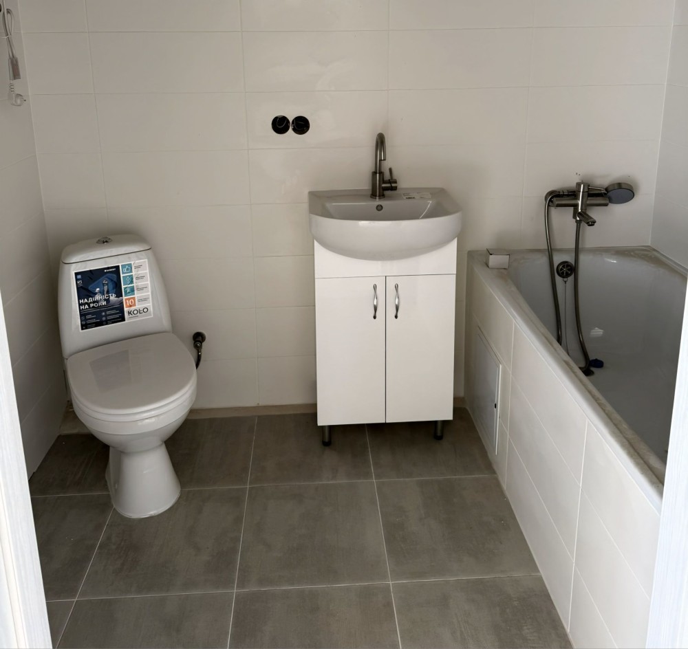 -Санузел полностью облицован плиткой: ванна, унитаз, раковина, бойлер