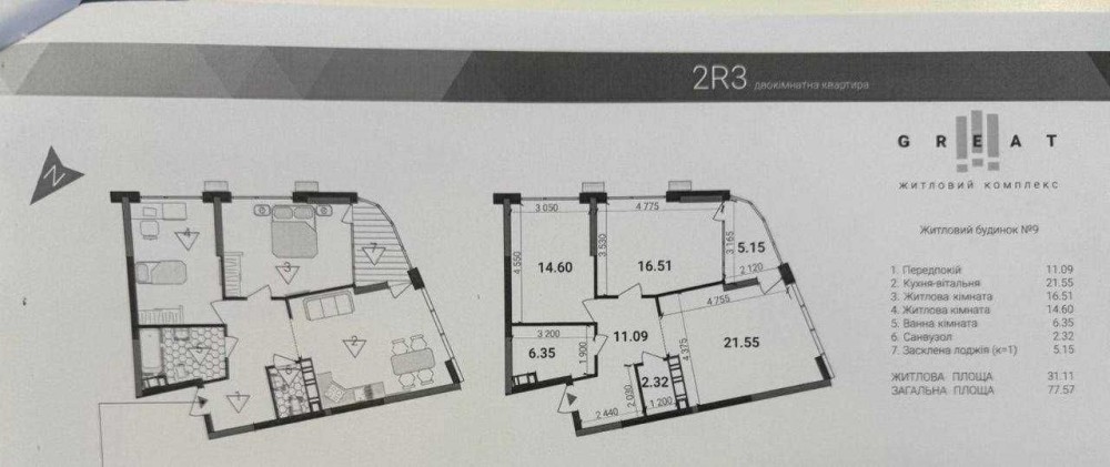 2-кімнатна квартира площею 77,57 м² у ЖК Great/Грейт, будинок 9.