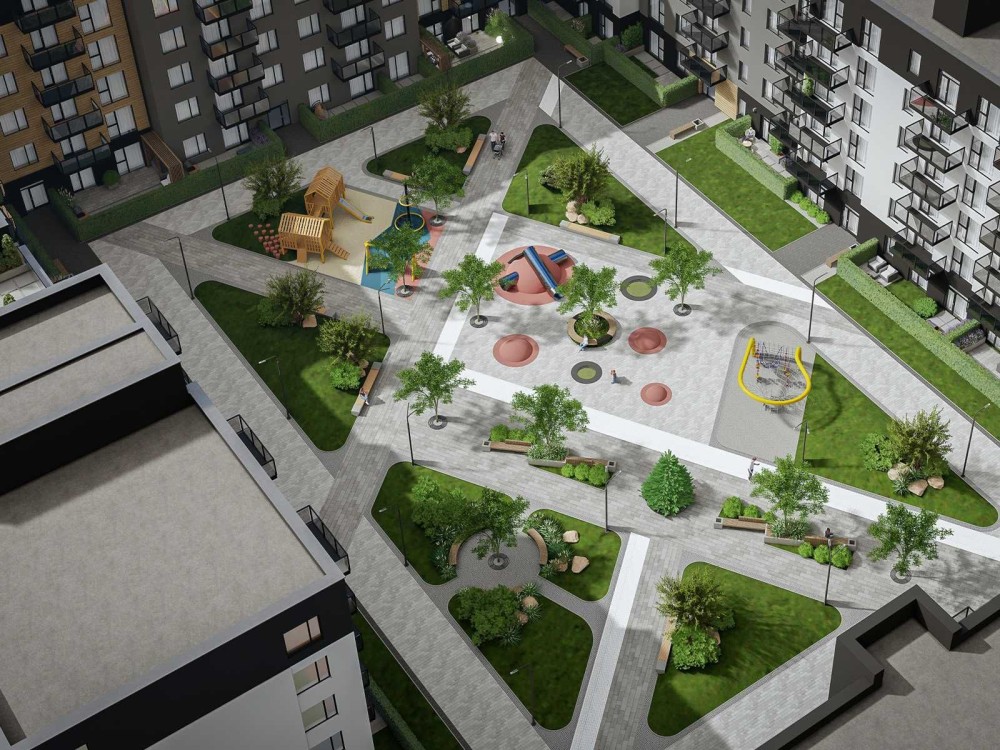 - Просторі двори без автомобілів;