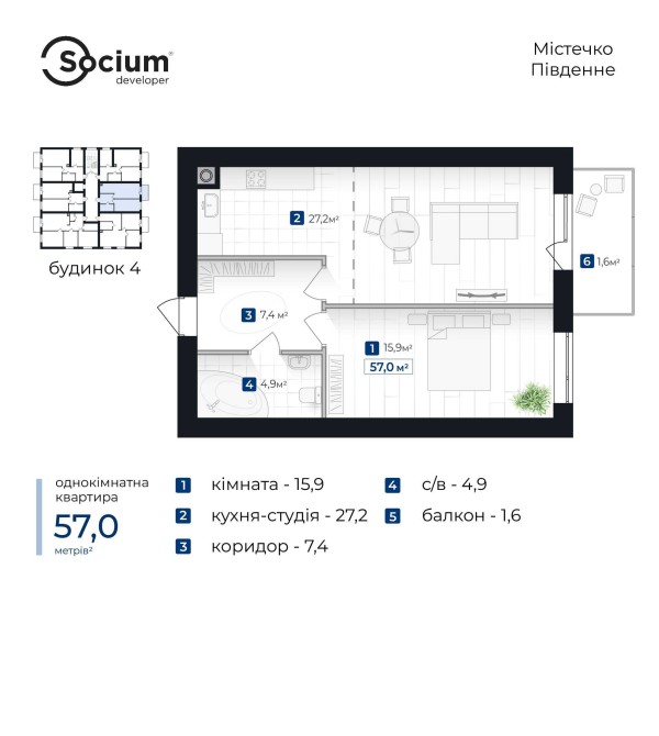 • Общая площадь 57 м2