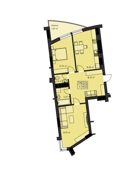 2 кімнатна 77,44 м2.
