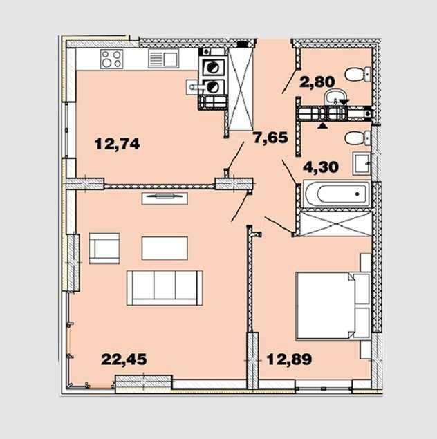 • Площадь кухни 12.74 м2
