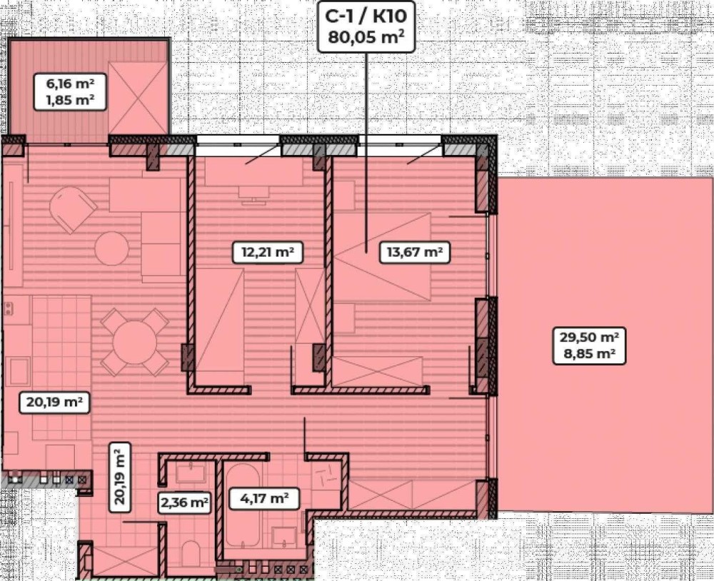Загальна площа — 80.05 м², житлова — 25.88 м², кухня —20.19 м².