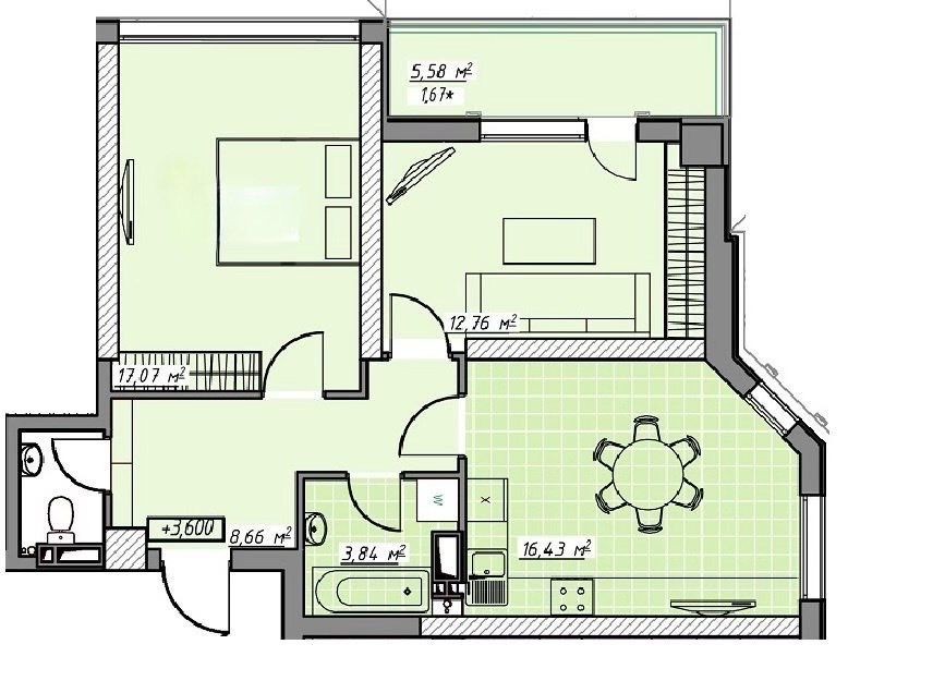 По плануванню: дві спальні, вбиральня та кухня-студія. Лоджія в спальні та кроковий балкон на кухні.