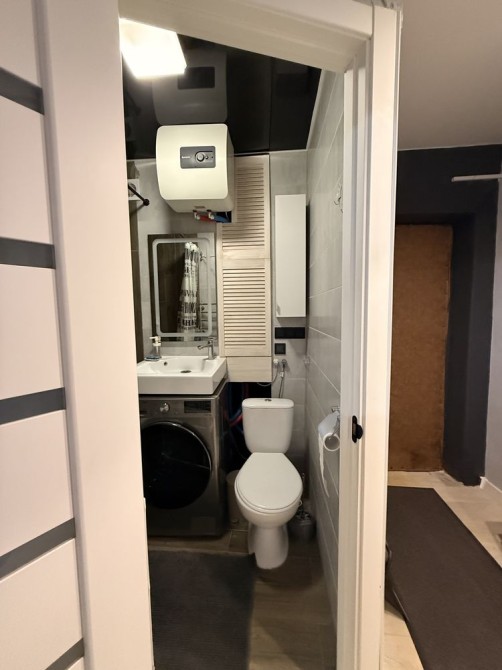 Санвузол з повноцінною ванною, встановлений електричний бойлер та прально-сушильна машина — зручно й без зайвих турбот (економія місця на сушці).