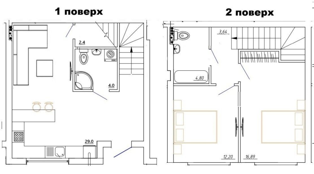 На першому поверсі: коридор, кухня-вітальня, санвузол. На другому: дві спальні та ще один санвузол. Панорамні вікна, тому в кімнатах багато природнього світла.