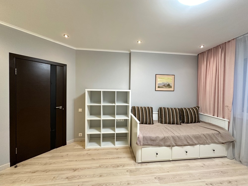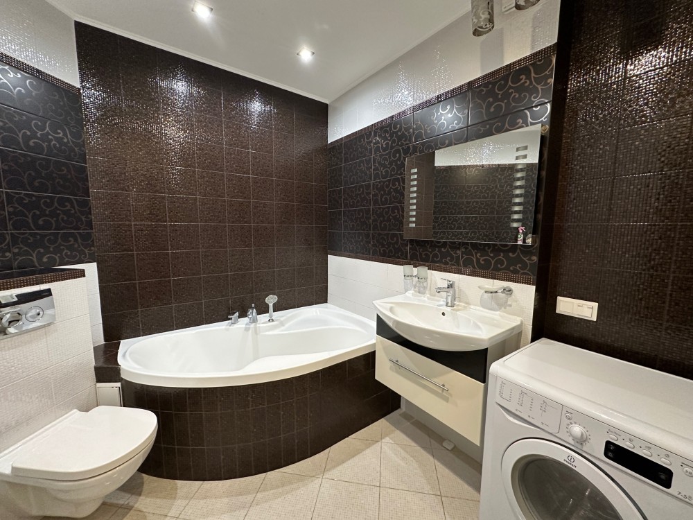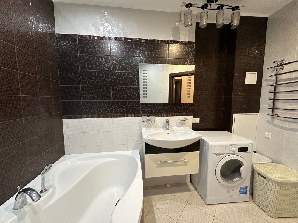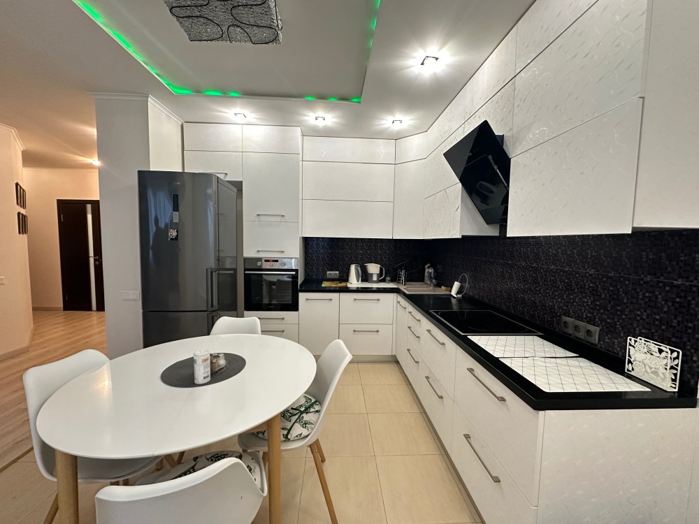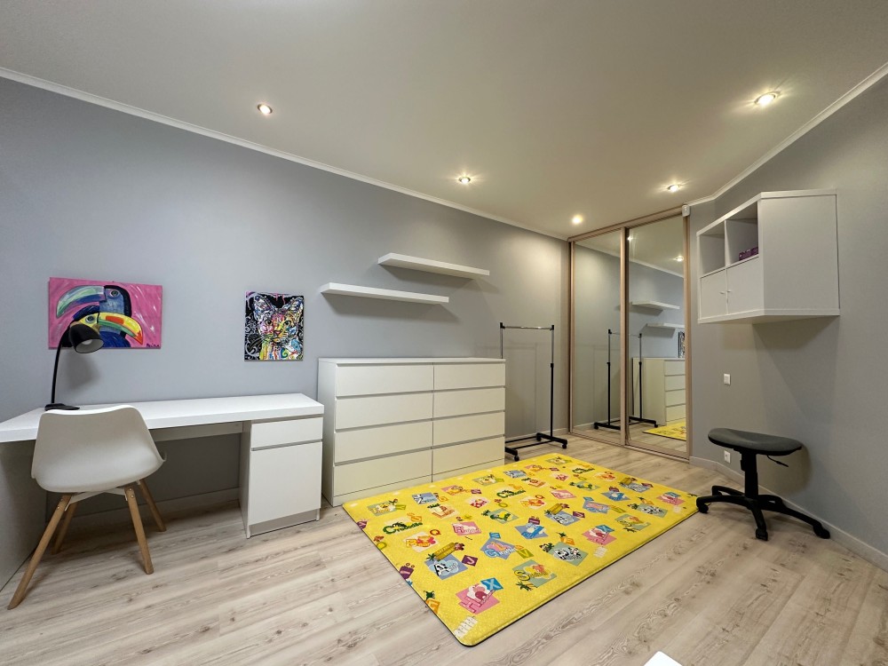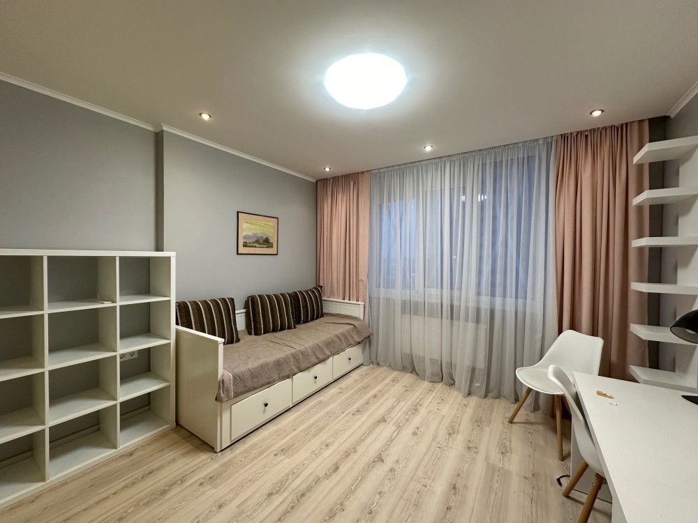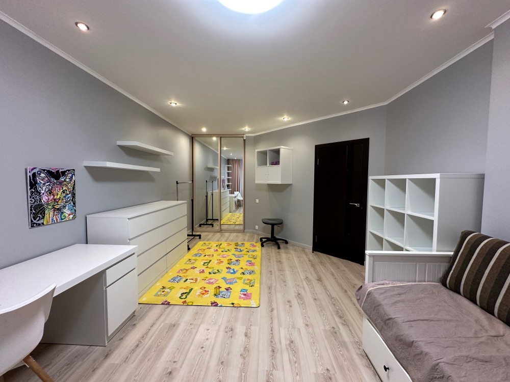 та надійною побутовою технікою. На кухні є холодильник, посудомийна машина, варильна та духовка. Квартира складається із кухні, що переходить у вітальню із повноцінним спальним місцем, окремої спальні, яка збільшена за рахунок просторої лоджії на якій облаштований робочий кабінет та великої дитячої кімнати із власною гардеробною.