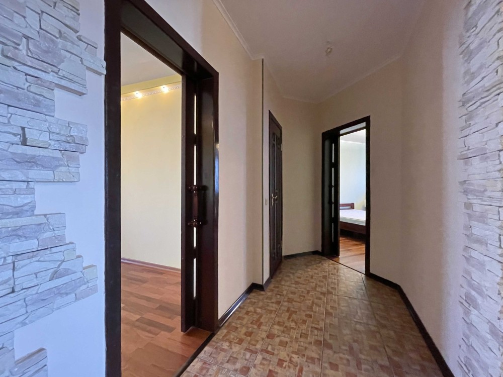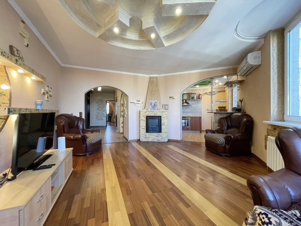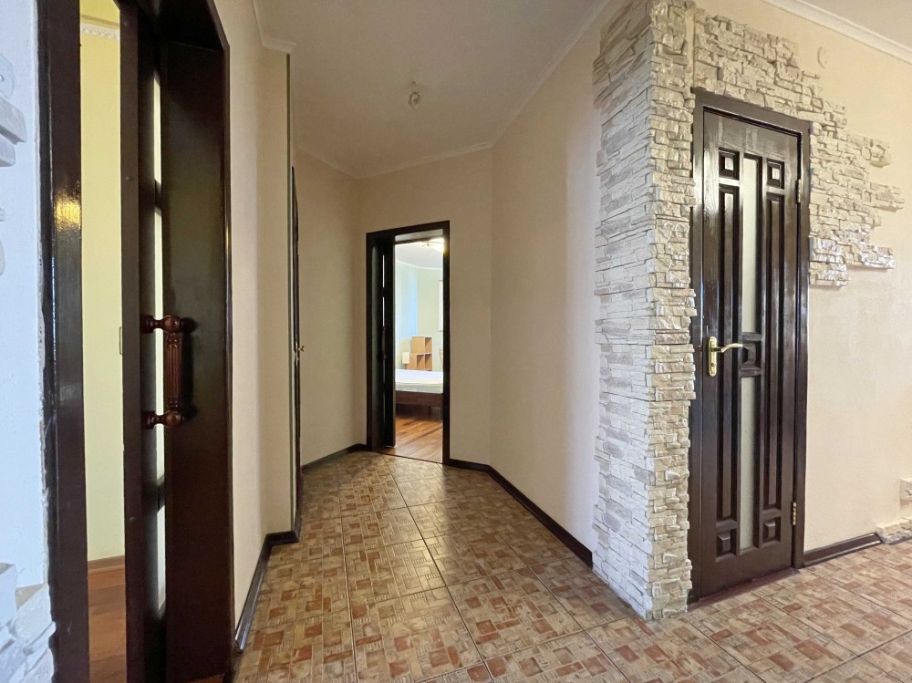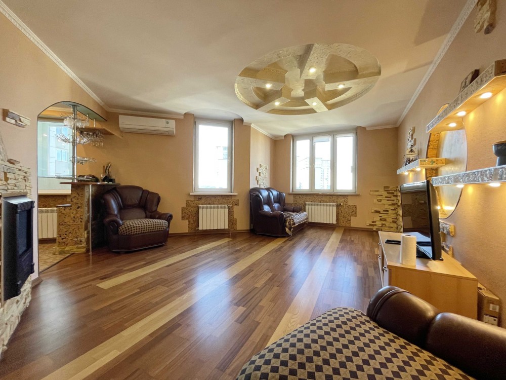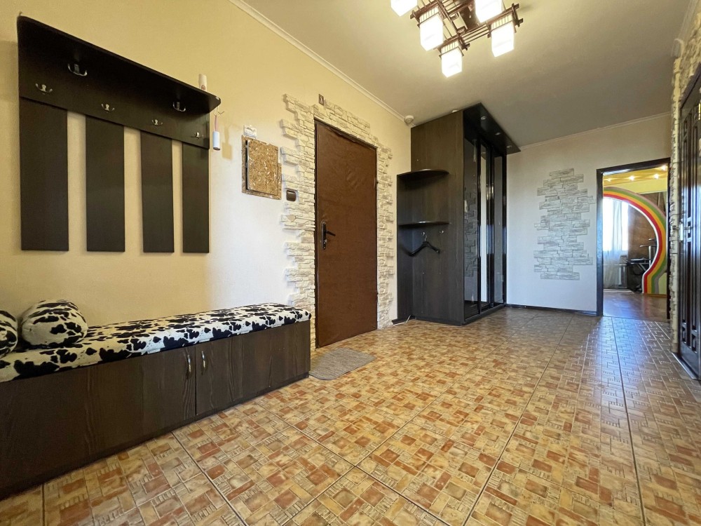 Квартира розташована на 14-му поверсі 24-поверхового будинку, загальною площею 97 м2, вітальня 24 м2, дві окремі кімнати по 18 м2 кожна, кухня 14 м2 з виходом на балкон, два санвузла, просторий передпокій.