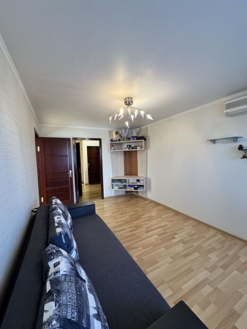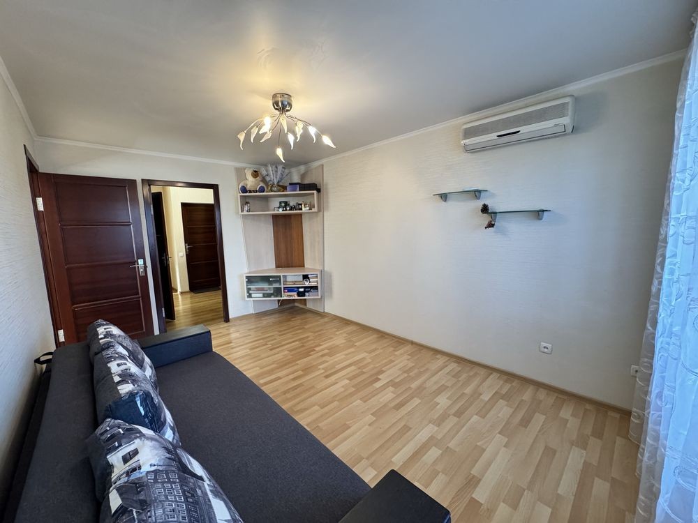 Квартира частково мебльована, залишається та входить у вартість всі вбудовані меблі, тобто кухонний гарнітур та шафи, кондиціонер.