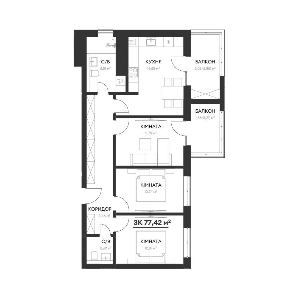 • Общая площадь 77.42 м2
