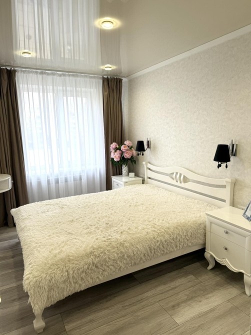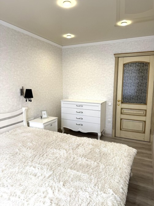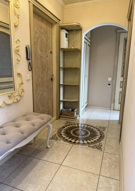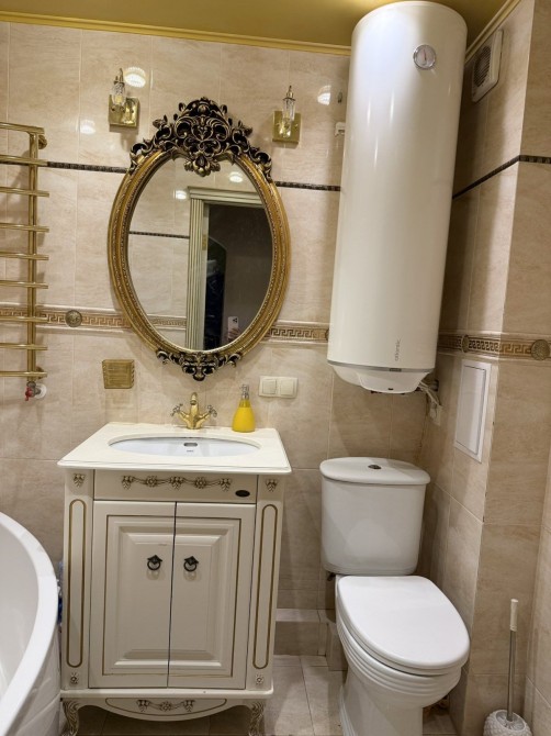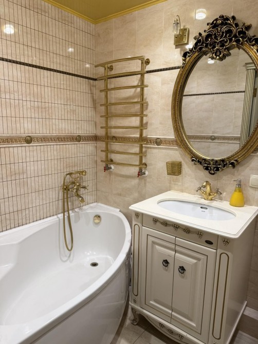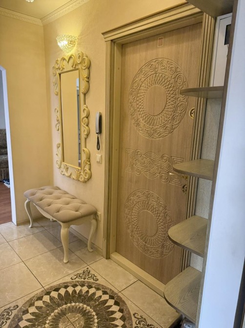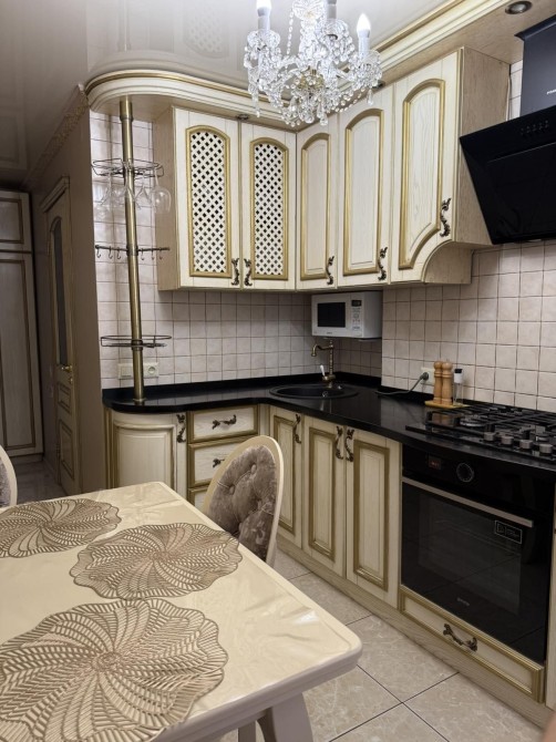 Квартира вирізняється справжнім класичним інтер'єром, де кожна деталь продумана до найменшої дрібниці. Міжкімнатні двері, кухонні меблі та всі меблі у квартирі виготовлені з натурального дерева з ручним різьбленням та золотою патиною. Ванна кімната - це окрема гордість: кована золота фурнітура, дзеркало в рамі барокко, підігрів рушників. На кухні панує атмосфера приватного ресторану - кришталева люстра, масивні дерев'яні фасади та вбудована техніка.