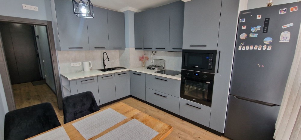 Повністю укомплектована якісними меблями та технікою від відомих брендів: холодильник, пральна машина, духова шафа, мікрохвильова піч, посудомийна машина, кондиціонер, 2 телевізори та інше. Багато освітлення та підсвітки, що створює приємну атмосферу ввечері. У коридорі містка шафа-гардероб.