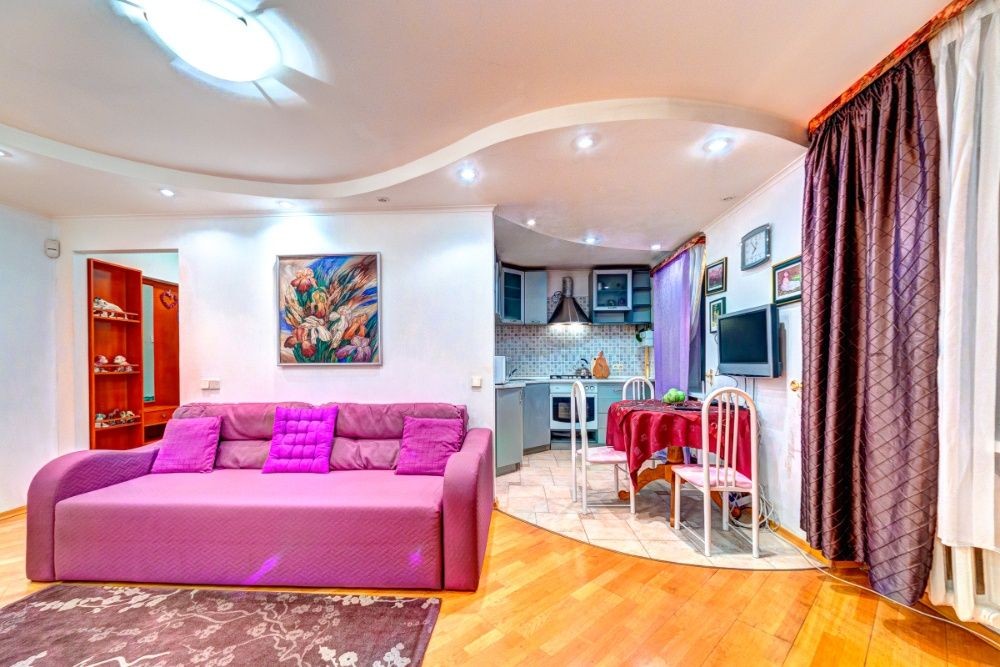 Гостиная-студио отличается по цветовому решению от спален, в которых присутствовали акценты на зеленый. Тут доминантным цветом служит фиолетовый. Диван (также двуспальный и раскладной), картины, что создают особую изысканную атмосферу, кондиционер, выход на балкон – это составляющие гостиной зоны. Кухонно-обеденная зона состоит с стола на трех персон, настенного телевизора и мебельного гарнитура. Бытовая техника следующая: