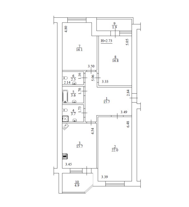 Двостороння. Площа 103 м²: житлова 55, кімнати 22+17+16, кухня 16. Стеля 2.72.