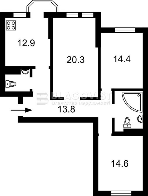 Планування: Простора кухня, три великі кімнати.