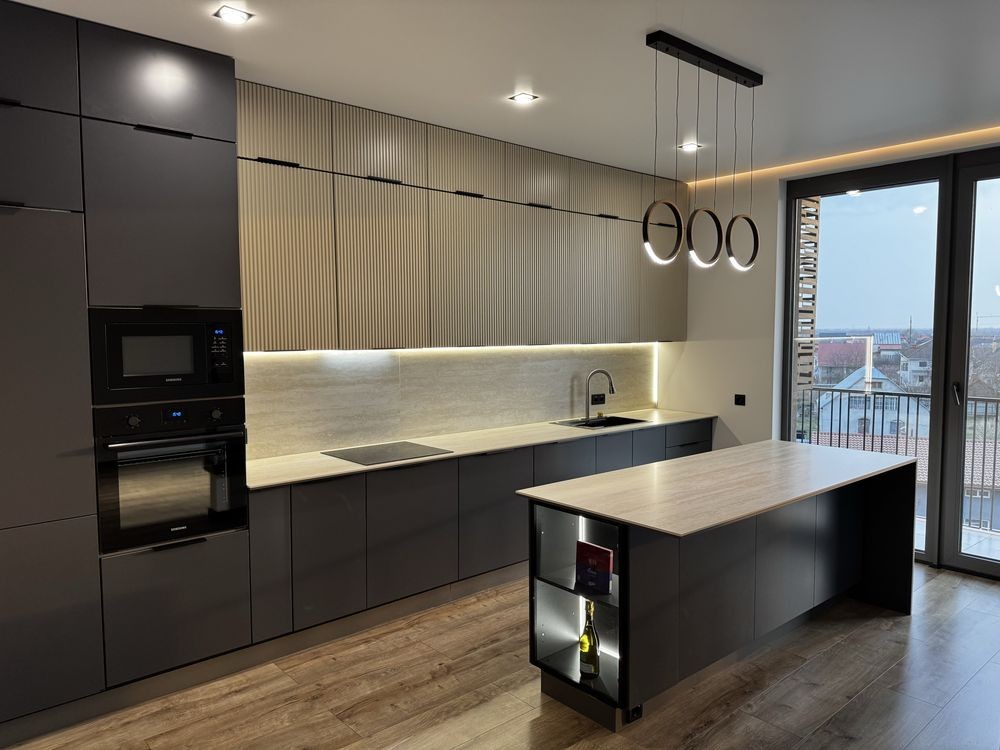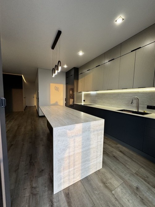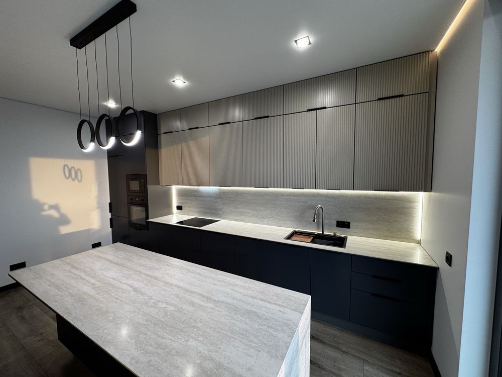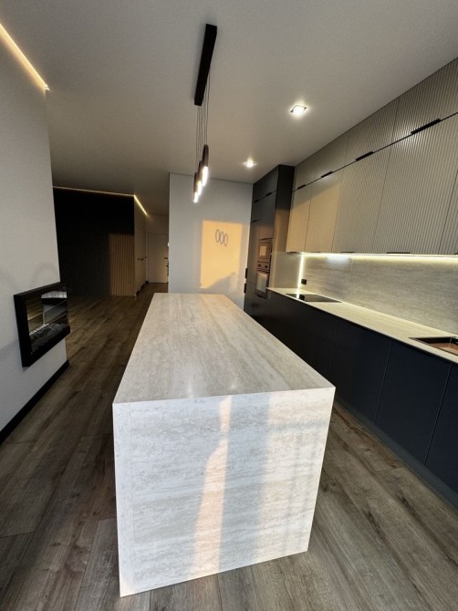 • Велика кухня-вітальня з дизайнерським островом (стільниця, фартух та острів — травертин)