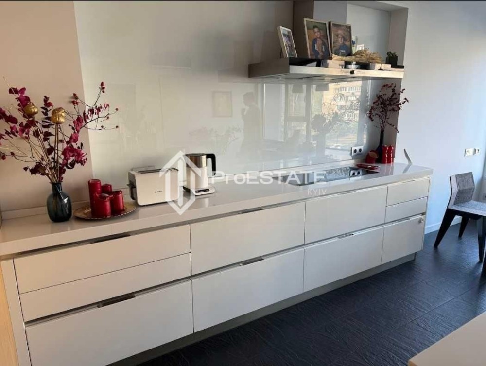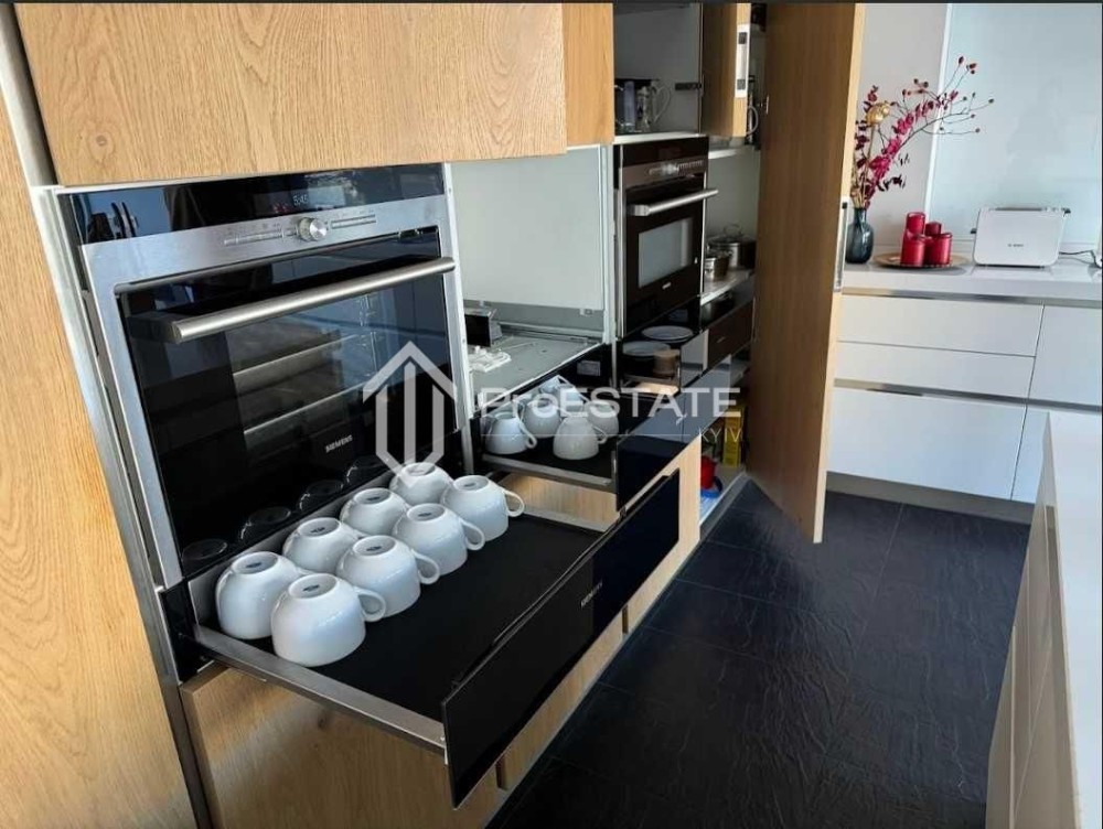 - Кухня-столова з островом – 30 м: елегантна кухня від італійського бренду Veneto Cucine, виконана в сучасному стилі, з вбудованою технікою Siemens (включно з мікрохвильовою піччю та духовкою, пароваркою та посудомийкою, вбудованим холодильником морозильна камера, електроплитою). Острів з вбудованою мийкою та робочою поверхнею забезпечує максимальний комфорт під час приготування їжі. Італійська плитка з підігрівом на підлозі додає відчуття затишку та тепла. На кухні також встановлено швейцарський фільтр Zepter для питної води. Обідній стіл із сучасним дизайном чудово підкреслює стильний інтер'єр. Є аудіопідготовка для встановлення звукової системи.
